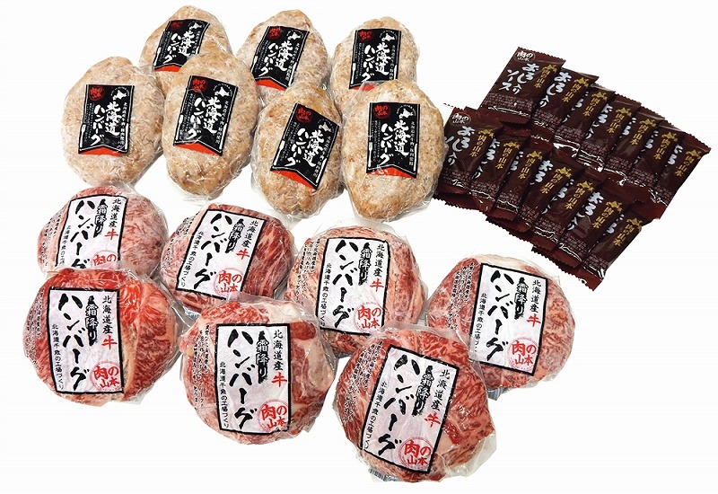 <セット内容> 牛霜降りハンバーグ150g×7、北海道ハンバーグ120g×7、おろしソース15g×14