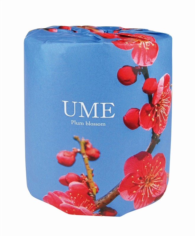 梅の花柄印刷入りのトイレットペーパーを個包装しています。 花柄トイレットペーパーは殺風景になりがちなトイレ空間を華やかに明るくしてくれます。