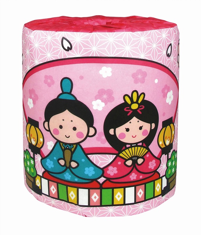 ひな人形柄の包装紙の中身は、ピンク無地のトイレットペーパーです。 低価格のため、景品や来店プレゼントなどのばらまき用販促グッズとして最適です。 春のイベントや、女性向け、子ども向けのイベントなどでご活用ください。