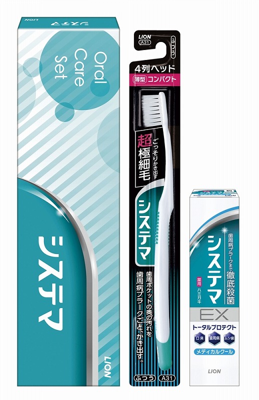 <セット内容> ・システマEXハミガキメディカルクール(30g)×1 ・システマハブラシコンパクト4列(ふつう)×1