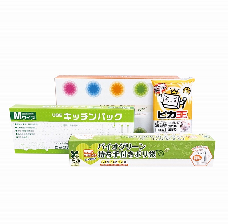 <セット内容> ・バイオグリーン持ち手付きポリ袋5枚×1 ・USEキッチンパックMサイズ10枚×1 ・ピカ王ミニ×1