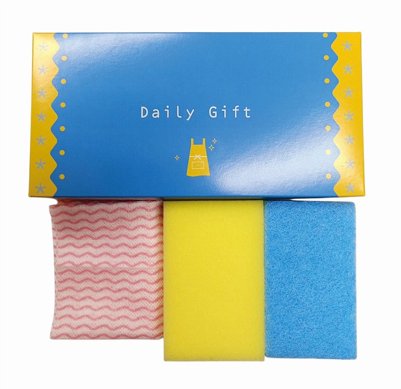 キッチン周りで使えるスポンジとふきんのクリーナーセット。化粧箱に入っているので販促品に便利です。