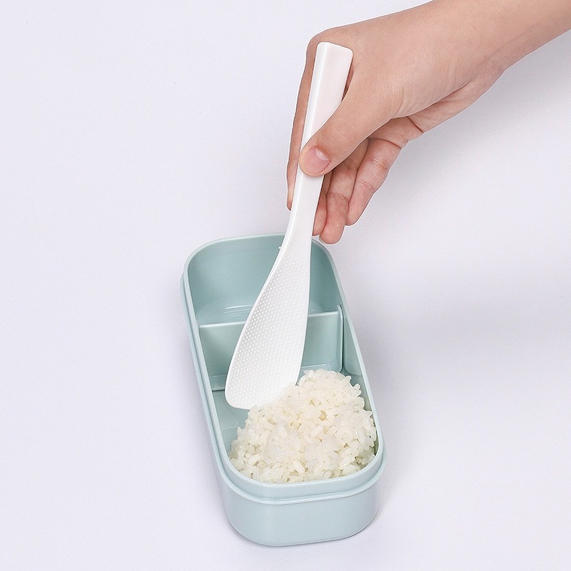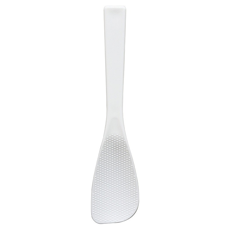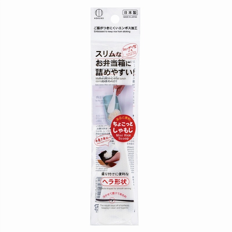 ミニサイズなのでスリムなお弁当箱や小さな型にご飯を詰めやすい。ご飯がくっつきにく加工と盛り付けに便利なヘラ形状。テーブル上で先端部分を浮かせて置ける脚付きで衛生的。