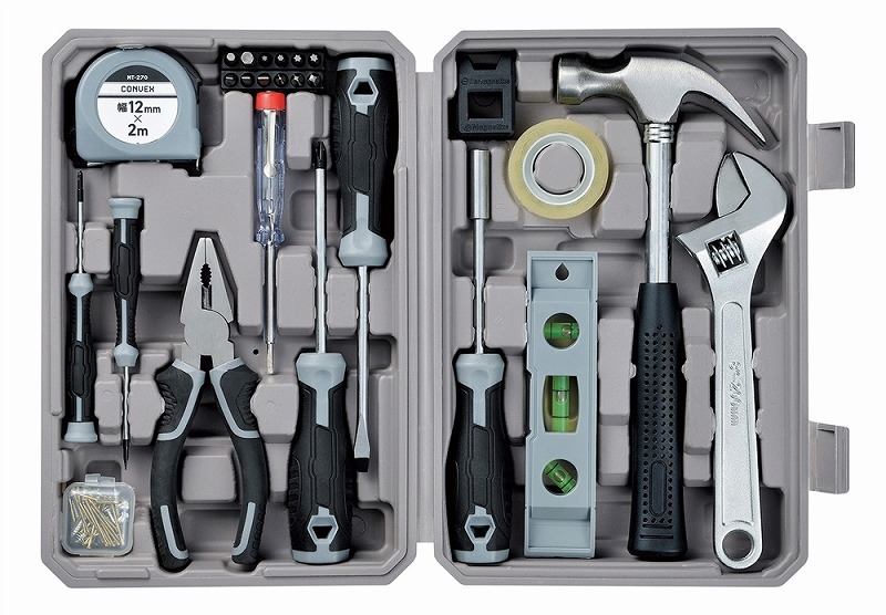 <セット内容> ・コンベックス×1 ・精密ドライバー(PH0/-2.4mm)×各1 ・ねじセット×1 ・ペンチ×1 ・ビット(12種)×各1 ・電気テスター×1 ・プラスドライバー(PH2)×1 ・マイナスドライバー(6mm)×1 ・着磁器×1 ・6.35mm角ドライバー型ハンドル×1 ・クリアテープ×1 ・水平器×1 ・ネイルハンマー×1 ・モンキーレンチ×1 ・収納ケース×1
