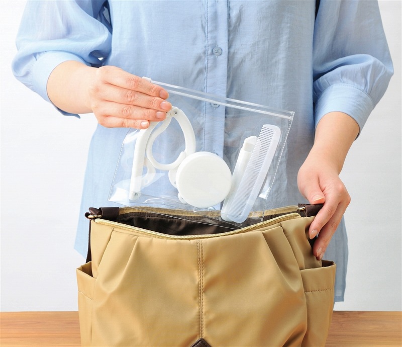 <セット内容> 収納ポーチ×1・ヘアコーム×1・組み立て式ハブラシ×1 伸縮式コップ(ピルケース付き)×1・折りたたみ式ハンガー×1