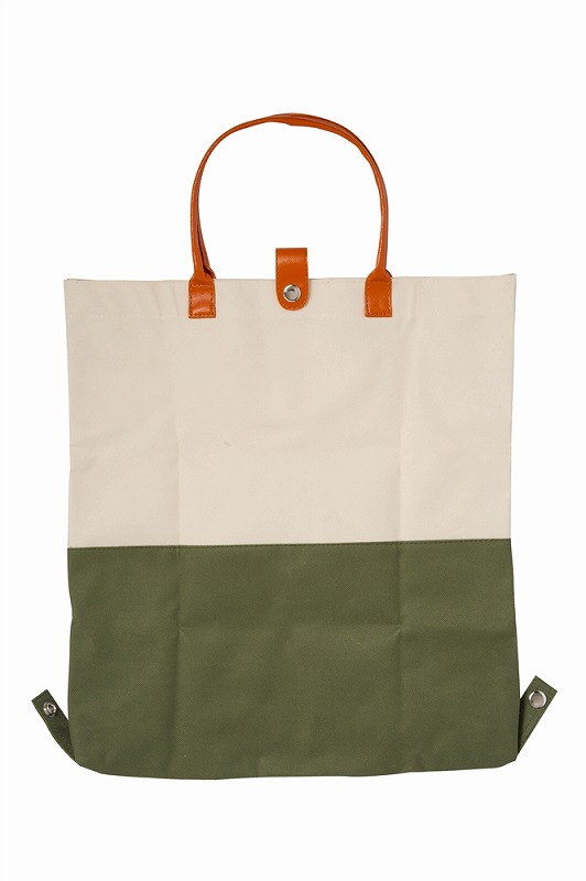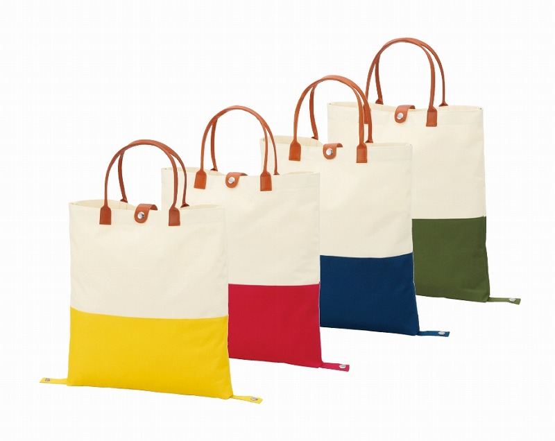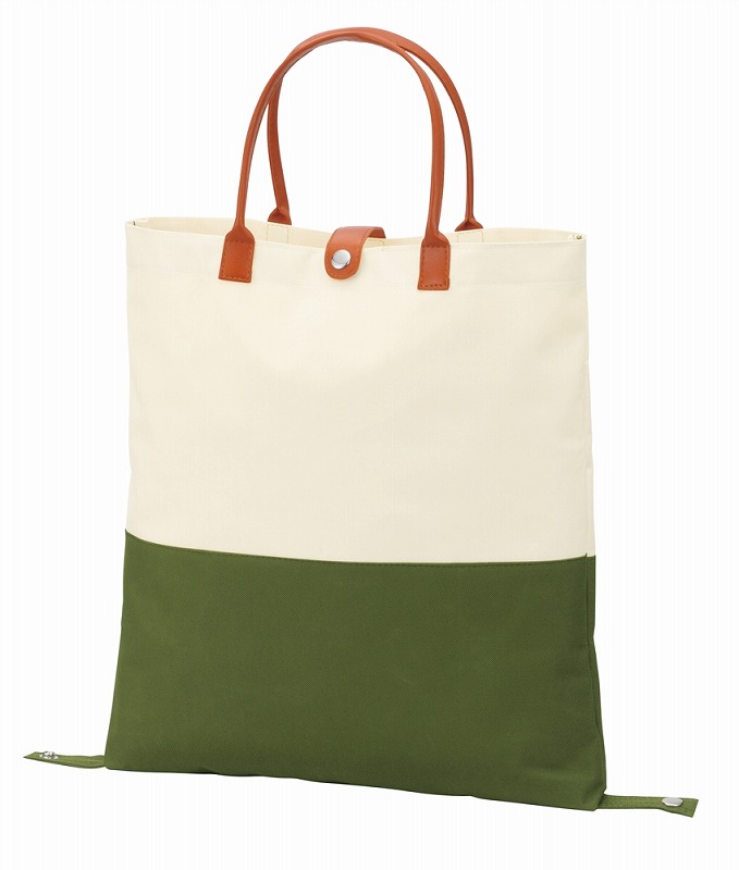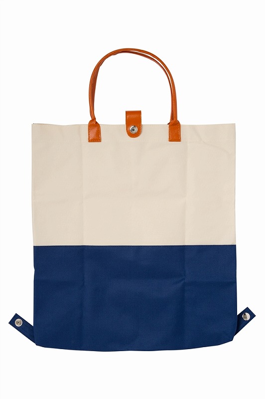 底のボタンを留めることでマチが作れ、シーンに応じてバッグの形状を変えられます。折りたためるので、持ち運びに便利。B4サイズ程度の荷物も収納可能。お買い物、旅行、イベントで大活躍。さらに、名入れ印刷が可能で、販促品として最適。レザー調の持ち手が高級感を演出し、購入者特典やセミナーのノベルティとしても好評です。