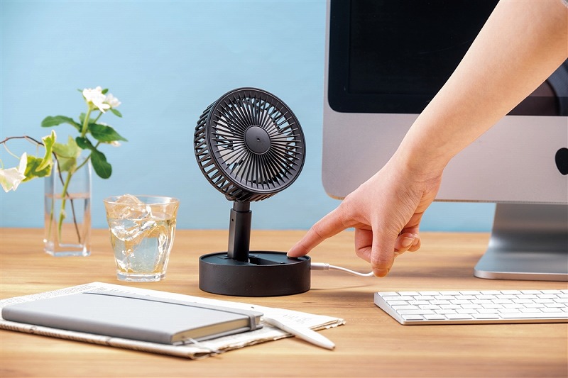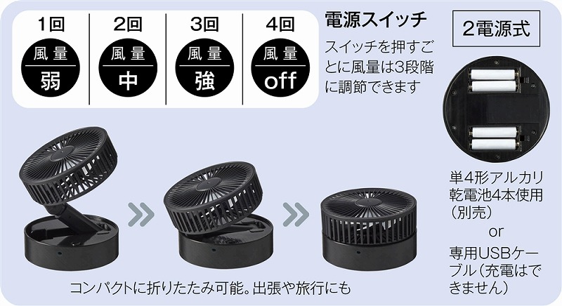 風量は3段階に調節可能。コンパクトに折りたためるので旅行や出張、アウトドアにも持ち運びやすい。