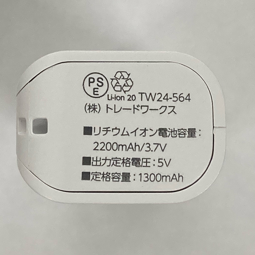 取説付、最大出力1A、バッテリー容量2200mAh、本体重量66g、Type-Cケーブル付属