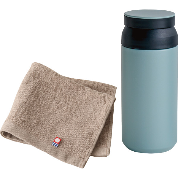 サーモボトルと今治タオルのセットです。ボトルは真空二重構造となっており飲み頃温度をキープします。