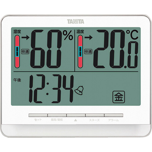 温度・湿度の快適レベルを5段階でお知らせし、さらに過去の最高・最低温湿度も表示できます。アラーム機能・スヌーズ機能もついた、置き掛け両用タイプのデジタル温湿度計です。