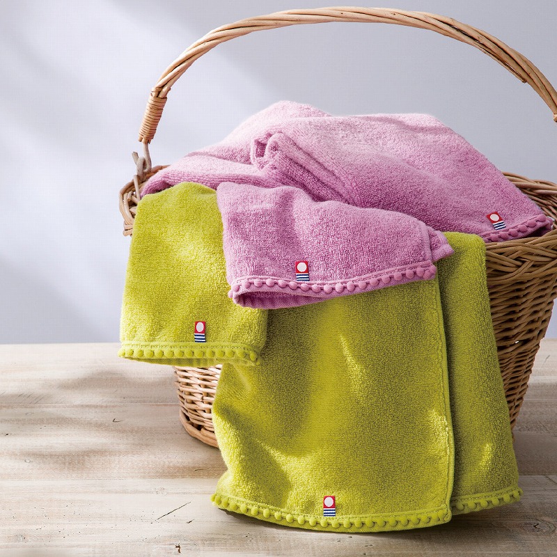 大人っぽいピスタチオカラーに可愛らしいポンポンを付けたタオルです。やわらかくて肌触りの良い無撚糸を使用しています。