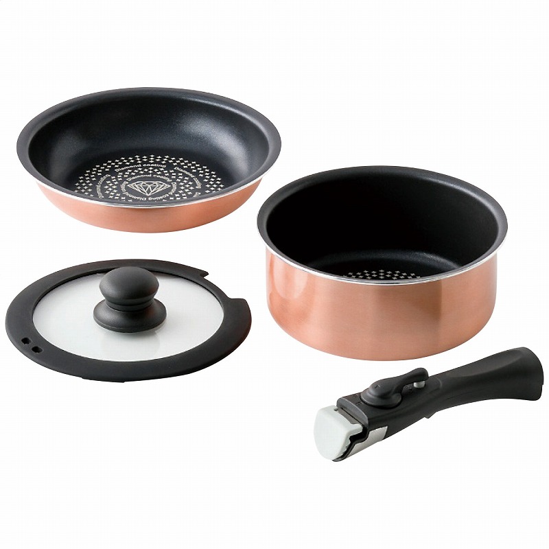 直径20cmフライパン・直径18cm鍋各1個・本体:アルミニウム合金(内面:ダイヤモンドコーティング)・底面:ステンレス鋼・ハンドル1個・フェノール樹脂、シリコン、ステンレス鋼・ガラス蓋18cm1個・強化ガラス、フェノール樹脂・[中国製]