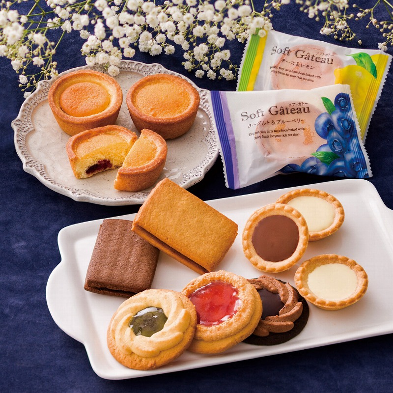 ロシアケーキ(マカロンストロベリー・フラワーキウイ・リッチビター各2個)・プチガトー(ミルクチョコ・ホワイトチョコ各3個)・ソフトガトー(ヨーグルト&ブルーベリー・チーズ&レモン各3個)・サンドクッキー(バニラ・ココア各3個)