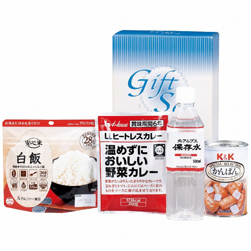 大観峯北アルプス保存水500ml×1本・K&Kかんぱん(氷砂糖入)110g×1缶・アルファー安心米(白飯)(スプーン付)100g・ハウスLLヒートレスカレー温めずにおいしい野菜カレー200g各1袋