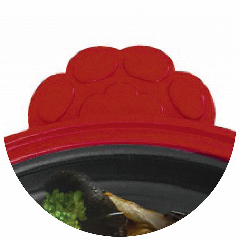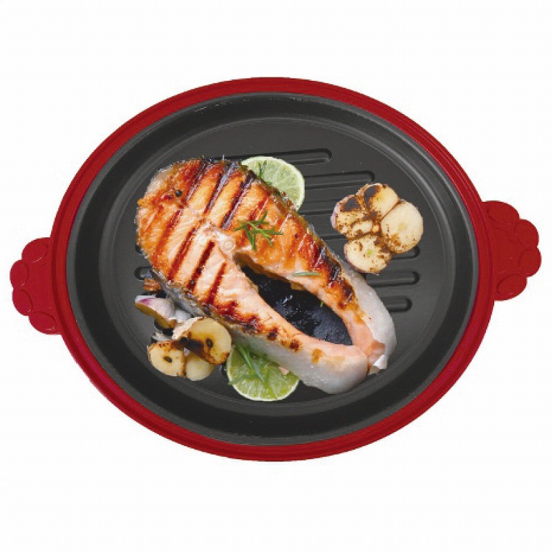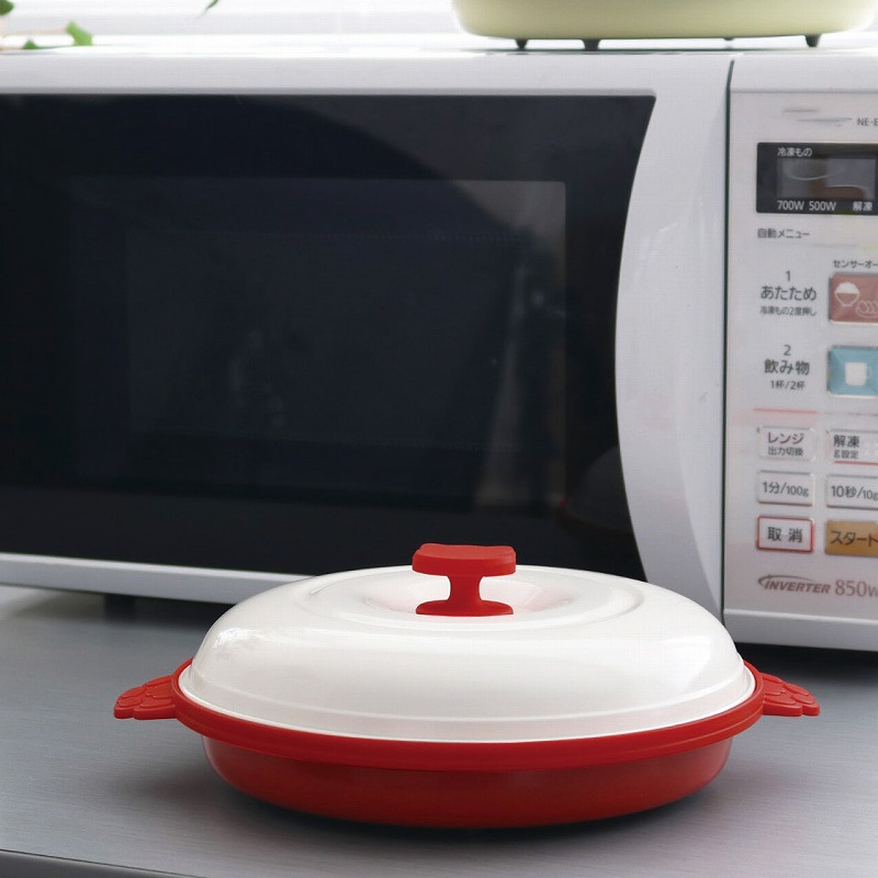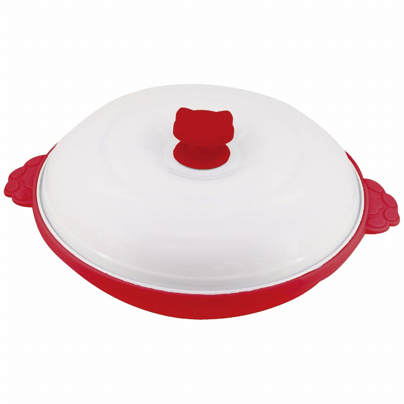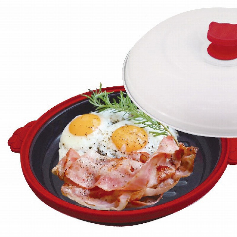 電子レンジで焼き目がつきます。炒める、焼く、茹でる、蒸す、煮る、炊くの一台6役なので、さまざまな料理が作れます。蓋のツマミと取っ手がかわいいネコのデザインになってます。レシピ本付。