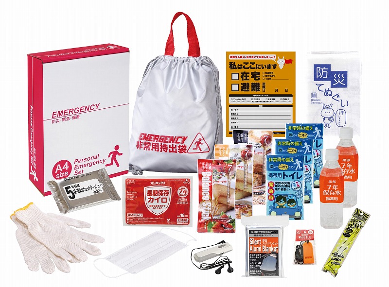 非常持出袋・防災用ウェットティッシュ・FMラジオ・7年保存水500ml×2・カイロ・軍手・静音アルミブランケット・バランススティック×3・緊急避難カード・防災てぬぐい・マスク・ホイッスル・発光スティック・携帯用トイレ1P×3