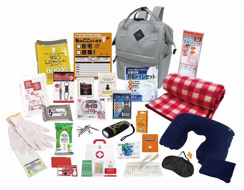 収納リュック・防災の心得・IDホイッスル&カラビナリング・カイロ・レインコート・抗菌消臭簡易トイレ3回分・トイレポンチョ・ダイナモマルチライト・軍手・アルミブランケット・フリースブランケット・救急てぬぐい・マスク・ウェットティッシュ・ネックピロー・アイマスク・耳栓・レジャーシート・カトラリーセット・8徳ナイフ・給水袋3L・ソーイングセット・緊急避難カード・水に流せるペーパー・救急4点セット・トランプ・歯磨きティッシュ