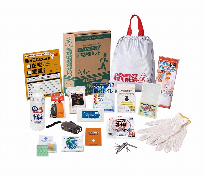 非常持出袋・防災の心得・ホイッスル・カイロ・レインコート・抗菌消臭トイレ・ダイナモLEDライト・軍手・アルミブランケット・マスク・除菌アルコールウェットティッシュ・、5年保存水500ml・8徳ナイフ・給水袋3L・緊急避難カード・水に流せるペーパー・綿棒&バンソウコウ