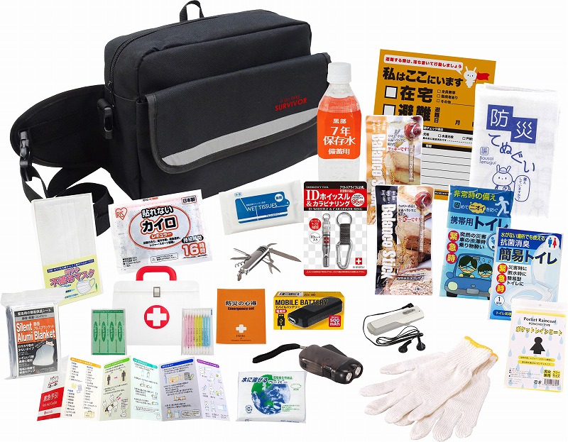 収納バッグ・防災の心得・IDホイッスル&カラビナリング・カイロ・レインコート・携帯用トイレ1P・抗菌消臭簡易トイレ1P・ダイナモLEDライト・モバイルバッテリー(乾電池式)・FMラジオ・軍手・静音アルミブランケット・防災てぬぐい・マスク・7年保存水500ml・バランススティック×2・8徳ナイフ・緊急避難カード・除菌アルコールウェットティッシュ・水に流せるペーパー・救急4点セット