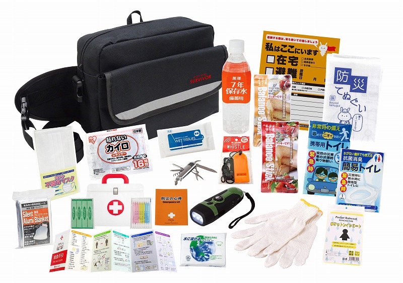 収納バッグ・防災の心得・ホイッスル・カイロ・レインコート・携帯用トイレ1P・抗菌消臭簡易トイレ1P・ダイナモ多機能ライト・軍手・静音アルミブランケット・防災てぬぐい・マスク・7年保存水500ml・バランススティック×2・8徳ナイフ・緊急避難カード・除菌アルコールウェットティッシュ・水に流せるペーパー・救急4点セット