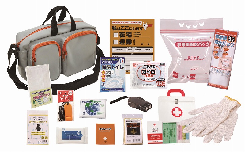 収納ショルダーバッグ・防災の心得・ホイッスル・カイロ・レインコート・抗菌消臭簡易トイレ1P・ダイナモLEDライト・アルミブランケット・マスク・給水袋3L・緊急避難カード・除菌アルコールウェットティッシュ・水に流せるペーパー・救急4点セット・軍手