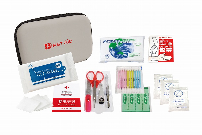 収納ケース・絆創膏5P・ワンタッチ包帯・コットンパフ3P・水に流せるペーパー・救急手引・アルコールハンドジェル×3・除菌アルコールウェットティッシュ・綿棒10P・爪切り・爪やすり・毛抜き・はさみ