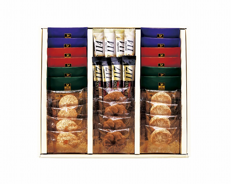 ティーバッグ(ダージリン・セイロン・アールグレイ)各4・クッキー(レモン・ソフト・オレンジ)各4・UCCザ・ブレンドスティックコーヒー(114・117)各4 [卵・乳成分・小麦]