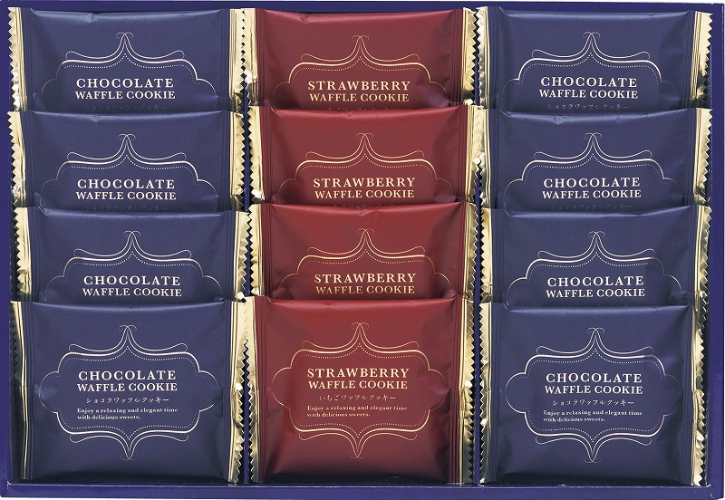 サクサク食感のワッフルクッキーにホワイトチョコクリームを詰めた風味豊かなショコラワッフルクッキーといちごチョコクリームを詰めたいちごワッフルクッキーの詰合せです。