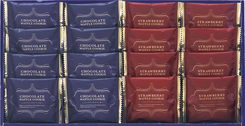 サクサク食感のワッフルクッキーにホワイトチョコクリームを詰めた風味豊かなショコラワッフルクッキーといちごチョコクリームを詰めたいちごワッフルクッキーの詰合せです。