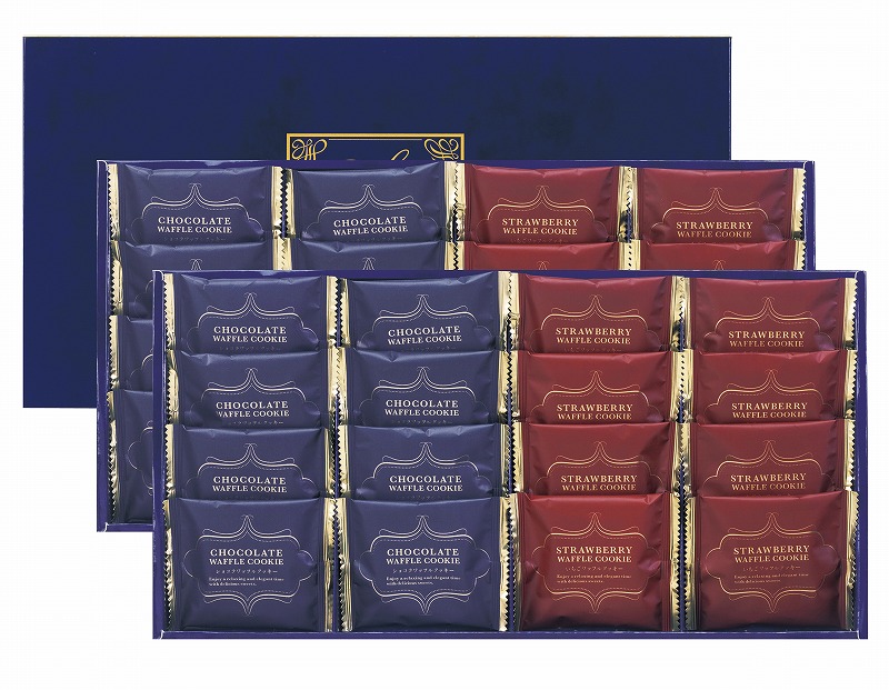サクサク食感のワッフルクッキーにホワイトチョコクリームを詰めた風味豊かなショコラワッフルクッキーといちごチョコクリームを詰めたいちごワッフルクッキーの詰合せです。