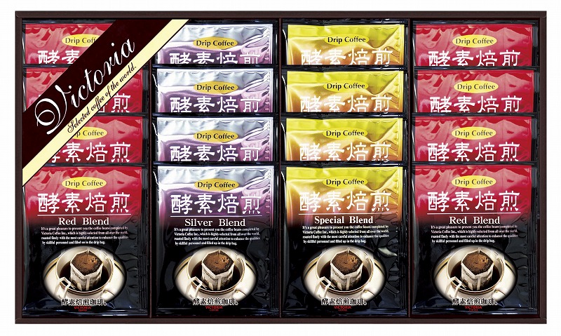 コーヒーがある、至福のひととき。 高品質なコーヒー豆と独自製法酵素焙煎によりそれぞれのコーヒーの特性を最大限に活かした焙煎技術による香り高い上品な旨味がバランスよく配分された3種類のドリップコーヒーをお楽しみください。 酵素焙煎コーヒーとは? 当社では玄米酵素を利用して独自製法により珈琲豆を活性化させる焙煎技術を取り入れています。そのためコーヒーが持つそれぞれの特性と旨みを最大限に引き出すことができ、おいしさをそのままドリップバッグに詰めてお届けします。 スペシャルブレンド 滑らかな旨味とコク、ほどよい上質な酸味のニュアンスをもった好バランスが印象的なコーヒーです。 レッドブレンド フルシティローストで仕上げ、ビターチョコのようなほろ苦い余韻とコクが味わえるクラシックなコーヒーです。 シルバーブレンド ソフトな口当たりで、優しい甘味とすっきりとした喉ごしを追求したとてもマイルドなコーヒーです。