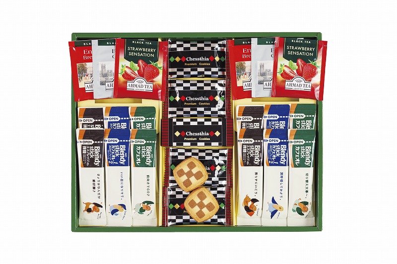 チェスティアクッキー×12・紅茶(アールグレイ・ブレックファースト・ストロベリー)2g×各2・AGFブレンディスティック(エスプレッソオレ6.2g・カフェオレカロリーハーフ5.4g・カフェオレ8.8g)各4 [卵・乳成分・小麦]