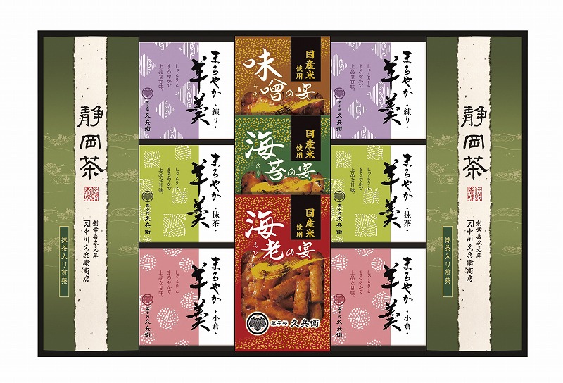 抹茶入り煎茶80g×2・あられ(海老・海苔・味噌)各12g・羊かん(抹茶・練り・小倉)60g×各2 [小麦・えび]