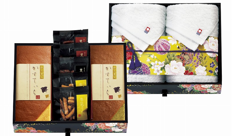 和三盆糖入かすてぃら(プレーン・抹茶)各1本・かりんとう(黒糖×2・黒胡麻×1・牛乳×2)各15g・フェイスタオル340×750mm×2 [卵・乳成分・小麦]