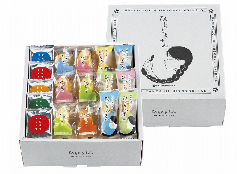 クラシック音楽を聴かせて仕込んだおかき「米と音のハーモニー」と、あっさり塩味とコクのあるカレー味のひねり揚げ「ひねりんぽん」、なつかしい味のミレーフライ「まんまるミレーヌ」の3種類のお菓子のアソートです。