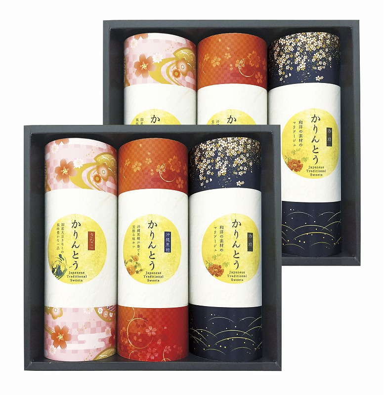 国産きなこをまぶし、甘さを抑え少し塩味に仕上げた懐かしい味のきなこかりんとうと、昔ながらの定番の味クセになる美味しさの風味豊かな黒かりんとう、珈琲の香ばしさが甘みを引き立ててくれる大人味の珈琲かりんとう、沖縄産黒糖を使用した黒糖の風味が広がる、ツヤが美しい沖縄黒糖かりんとうの詰合せです。