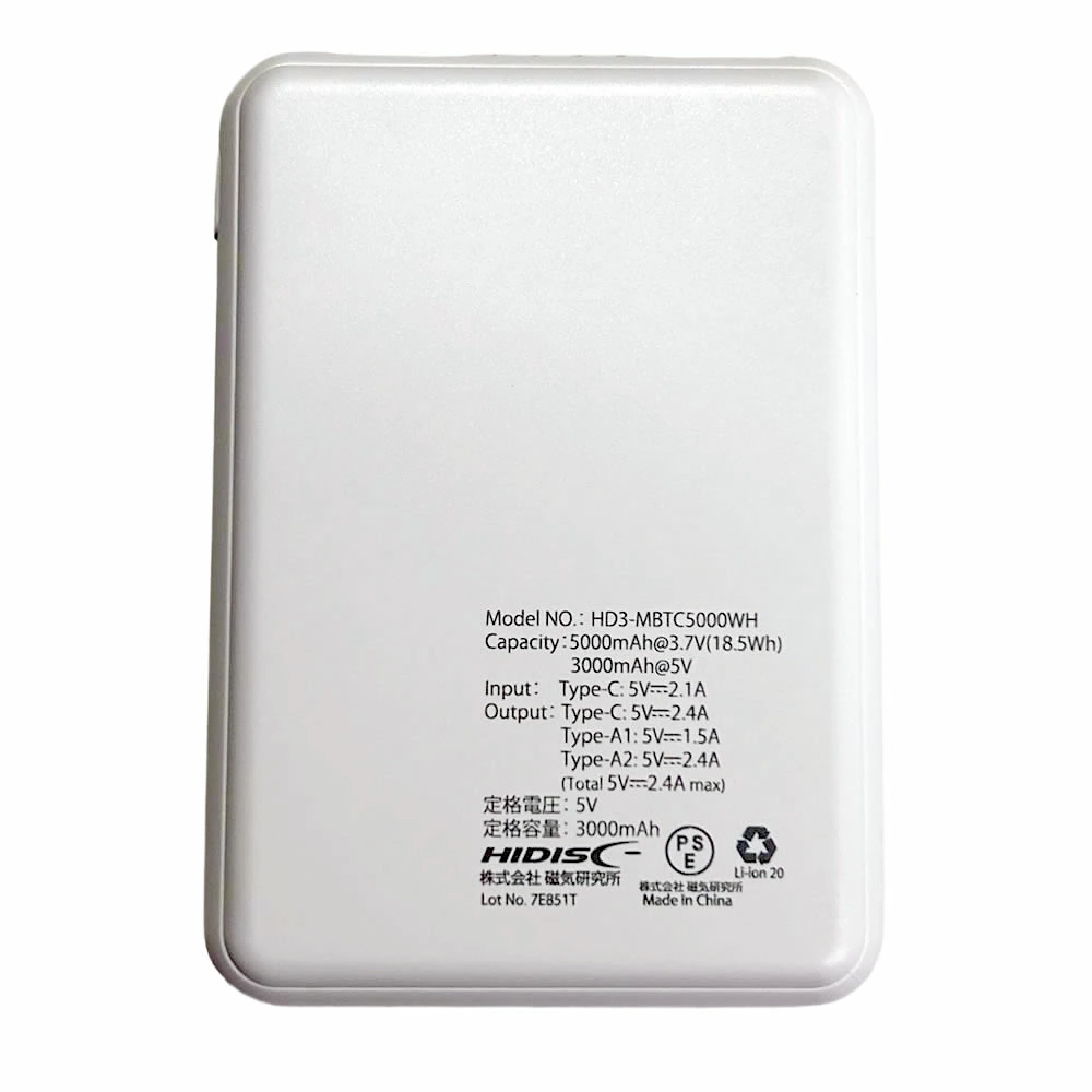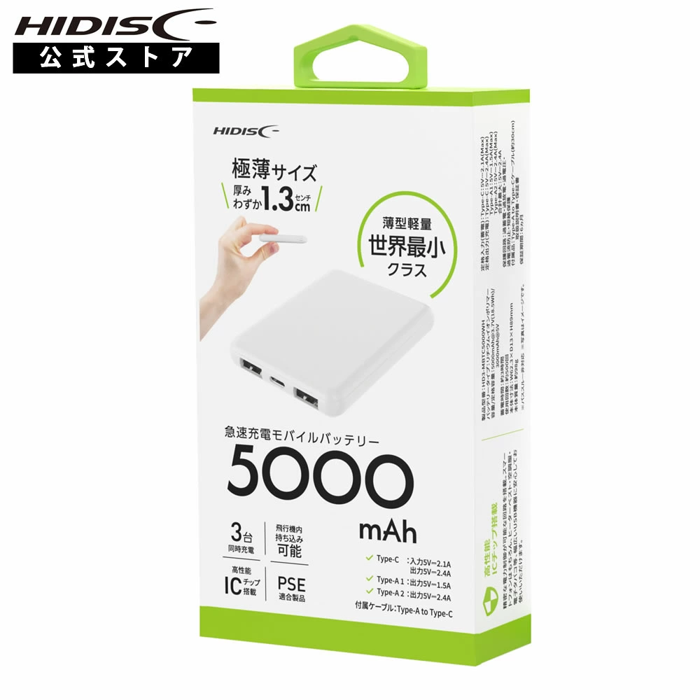 HIDISC Type-C入出力対応 5000mAh 薄型コンパクトモバイルバッテリー ホワイト