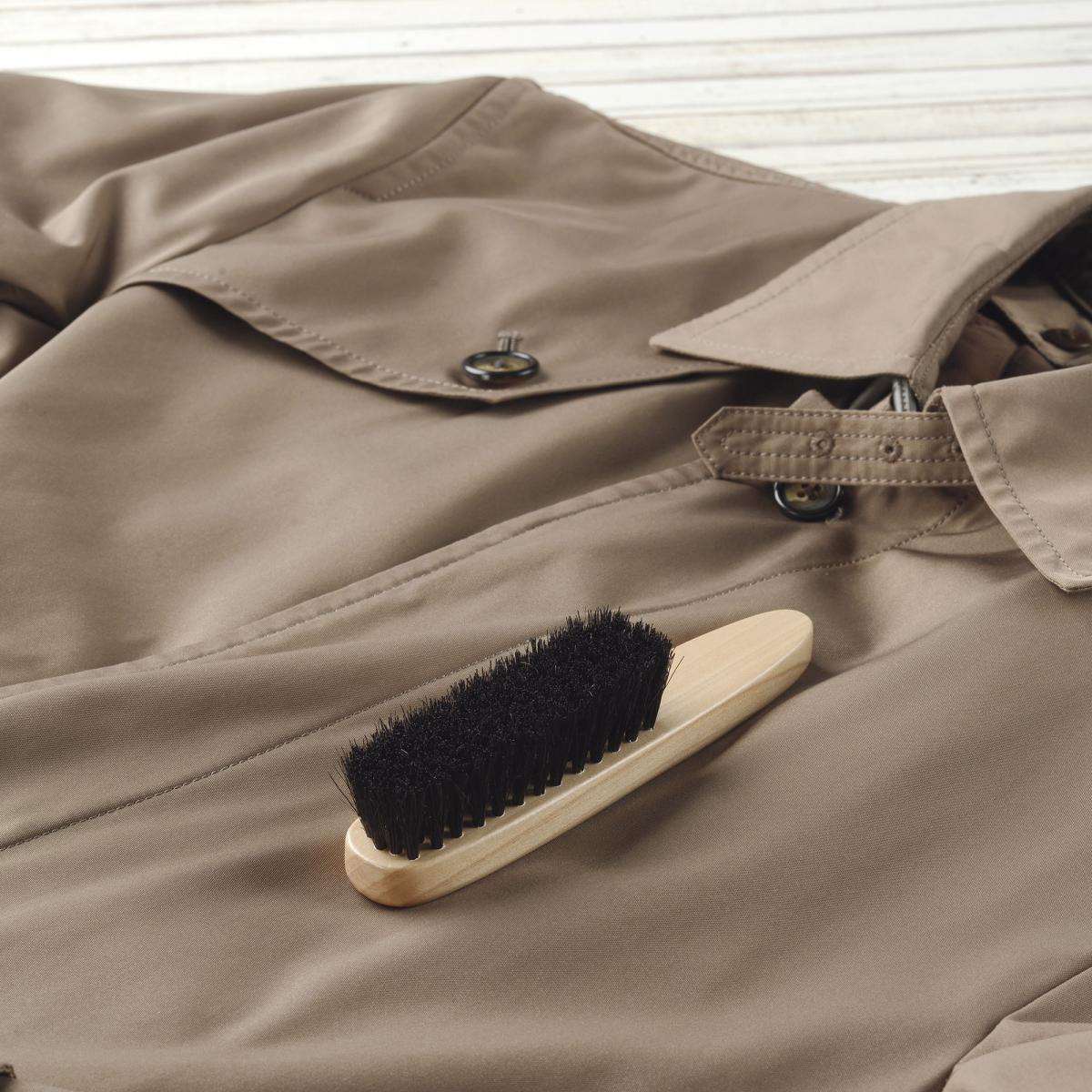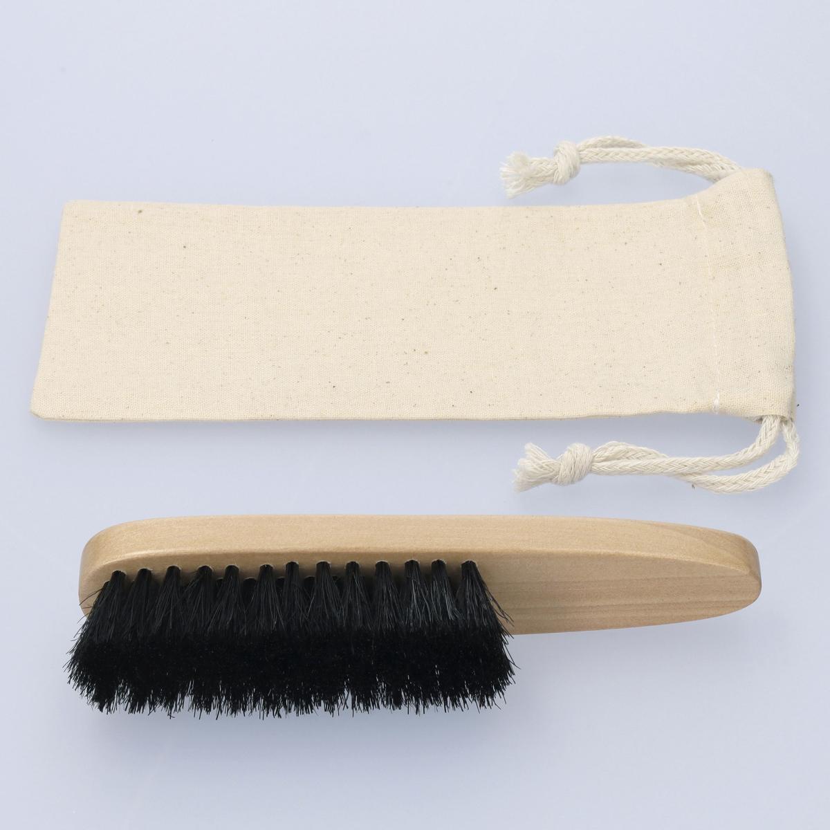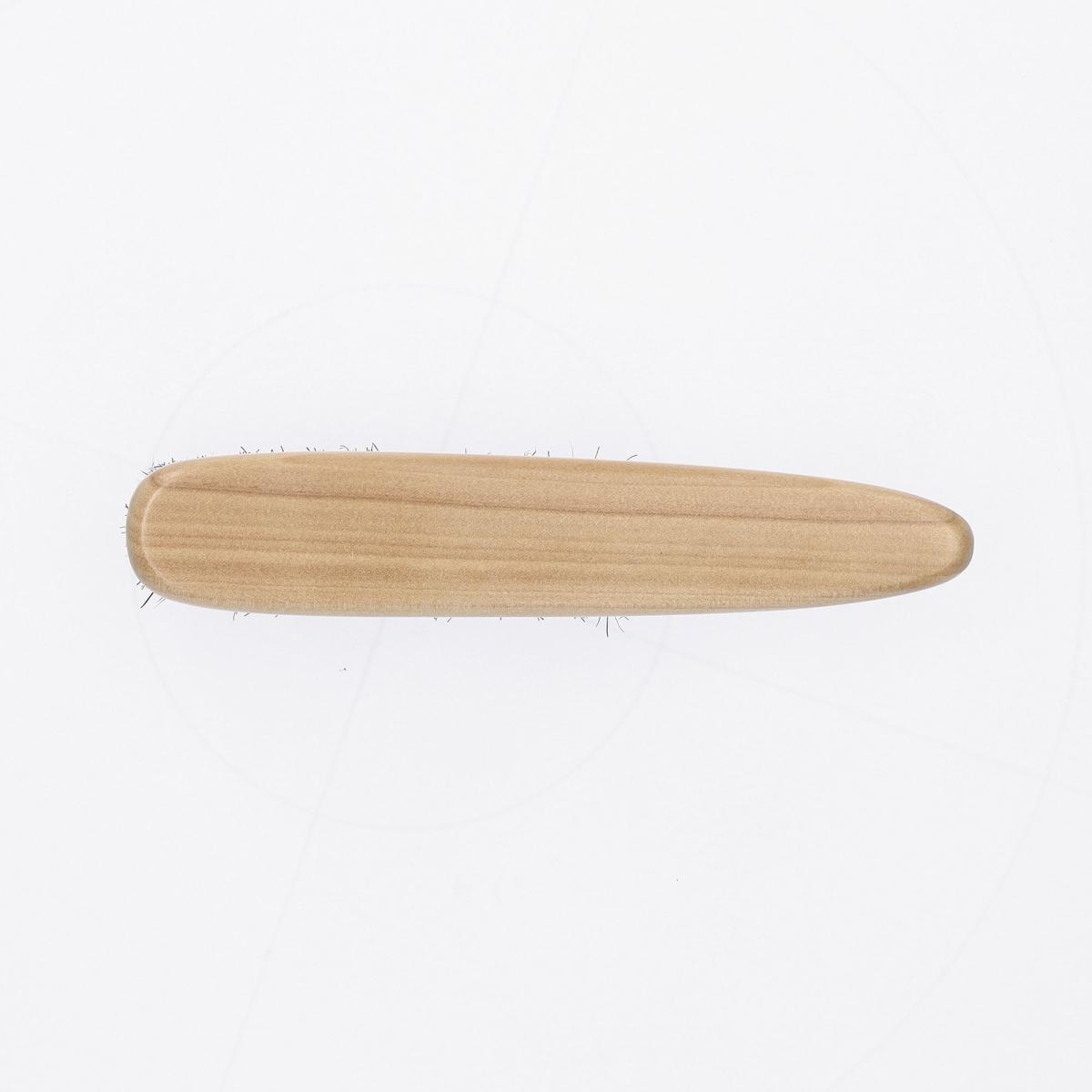 お出かけ先でも身だしなみには手を抜かず。持ち手は木製、毛は豚毛の本格派。