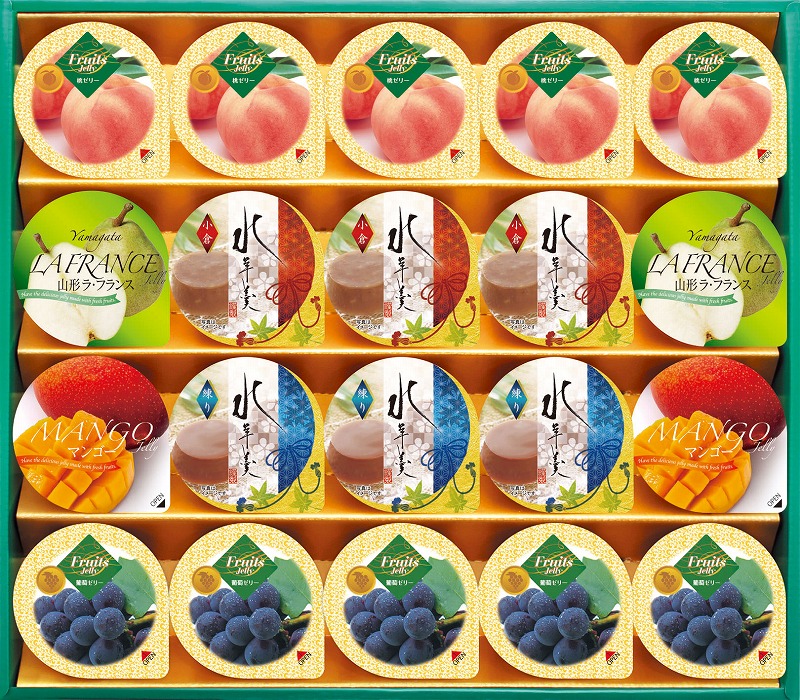 桃ゼリー 52g×5個、葡萄ゼリー 52g×5個、水羊羹小倉 60g×3個、水羊羹練り 60g×3個、山形ラ・フランスゼリー 52g×2個、マンゴーゼリー 52g×2個