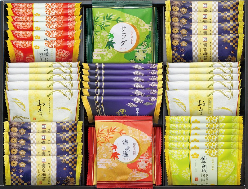 黒豆おかき×10枚、青さ海苔煎餅×8枚、のり巻あられ×6枚、柚子胡椒煎餅×6枚、海老カレー煎餅×6枚、海老塩煎餅×3枚、サラダ煎餅×3枚