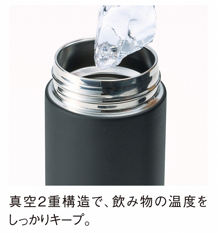 お手入れが簡単な真空2重構造のステンレスボトル。