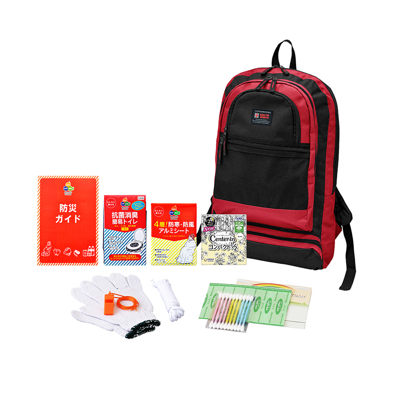 ●セット内容:デイパッグ、生理用品、4層!防寒・防風アルミシト、抗菌消臭・簡易トイレ、防災ガイド、絆創膏5枚、綿棒10P、軍手、ロプ、笛