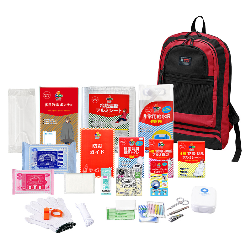 ●セット内容:デイパッグ、非常用持出袋3L、冷熱遮断アルミシト、多目的deポンチョ、マスク、4層!防寒・防風アルミシト、4層!防寒・防風アルミ寝袋、抗菌消臭・簡易トイレ、防災ガイド、エピスタプロプルピロタイプ、新ソラ&ダイナモLEDライト(3色アソト)、生理用品、除菌ジェル、ポケットティッシュ、エピスタプロプルハンディタイプピンク、軍手、ロプ、笛、絆創膏5枚、綿棒10P、?コットンパフ3枚、?ワンタッチ包帯、?爪切り、?毛抜き、?ハサミ
