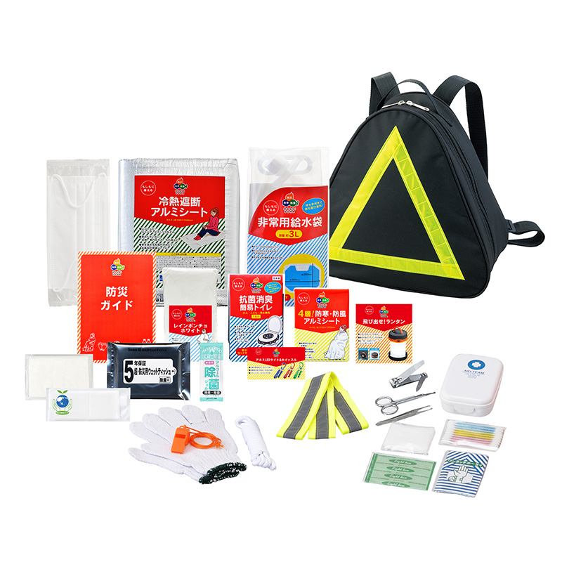 ●セット内容:リュック型ピラミッドバッグ、非常用持出袋3L、冷熱遮断アルミシト、マスク、飛び出せ!ランタン、4層!防寒・防風アルミシト、抗菌消臭・簡易トイレ、レインポンチョホワイト、防災ガイド、アルミLEDライト&ホイッスル、除菌ジェル、防災用ウェットティッシュ(20枚入)、ポケットティッシュ、eco便利バッグ、新反射安全タスキ、軍手、ロプ、笛、絆創膏5枚、綿棒10P、?コットンパフ3枚、?ワンタッチ包帯、?爪切り、?毛抜き、?ハサミ