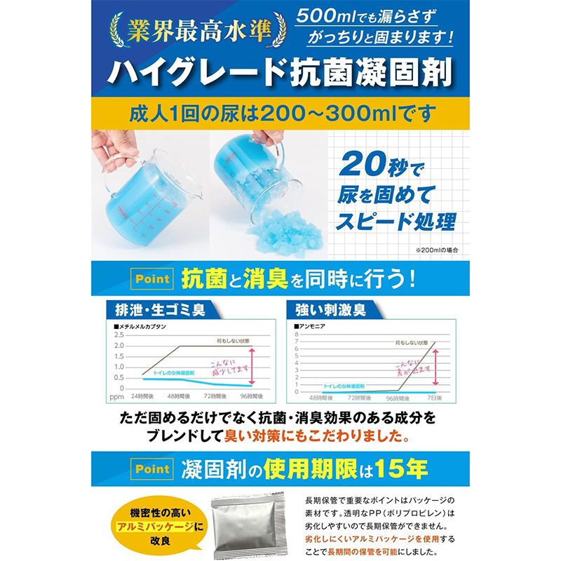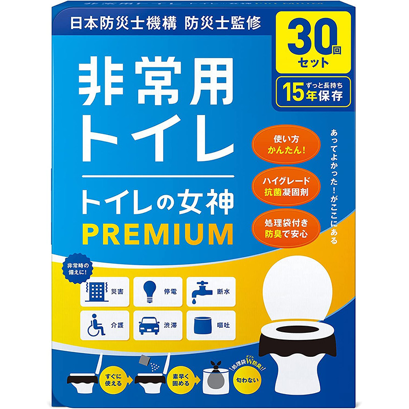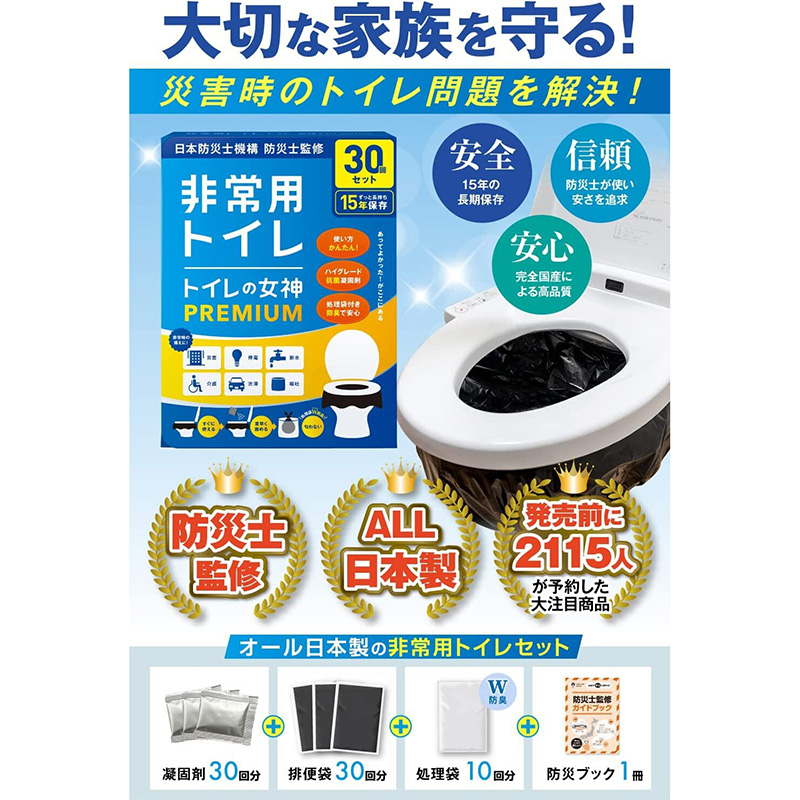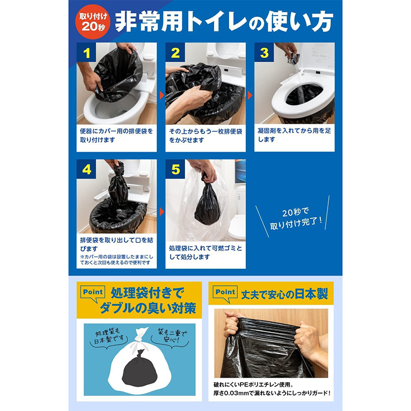 ●セット内容:凝固剤×30袋、排便袋×30枚、処理袋×10枚、取り扱い説明書×1枚、防災ガイドブック×1冊