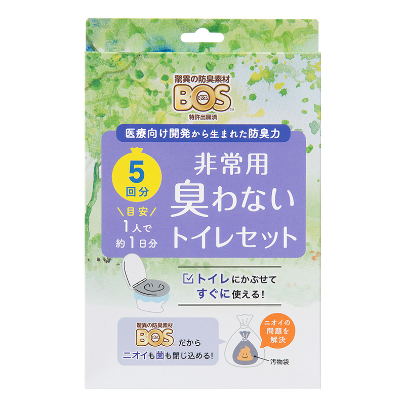 ●セット内容:驚異の防臭袋BOS・凝固剤・汚物袋各5個、便器カバ 1個