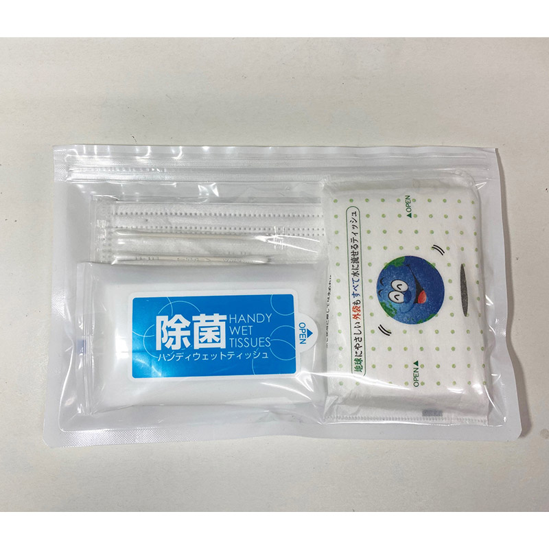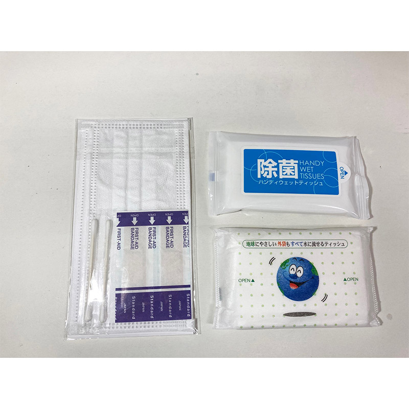 ●セット内容:除菌ハンディウェットティッシュ10枚、全て水に流せるポケットティッシュ10W、個装マスク1枚、絆創膏M2枚、両軸綿棒2本