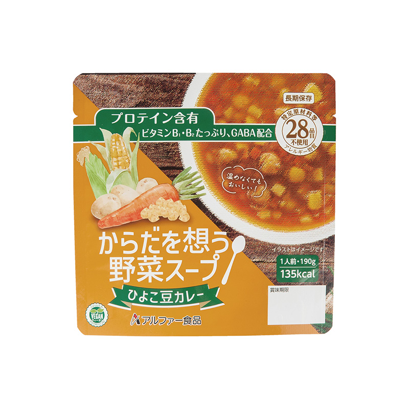 野菜(スイトコン、にんじん、じゃがいも)、ひよこ豆(カナダ又はアメリカ)、植物油、砂糖、たまねぎエキス、エンドウタンパク、トマトケチャップ、トマトペスト、食塩、カレパウダ、酵母エキス、ガリックパウダ、GABA/乳化剤、塩化カルシウム、ビタミンB1、ビタミンB2