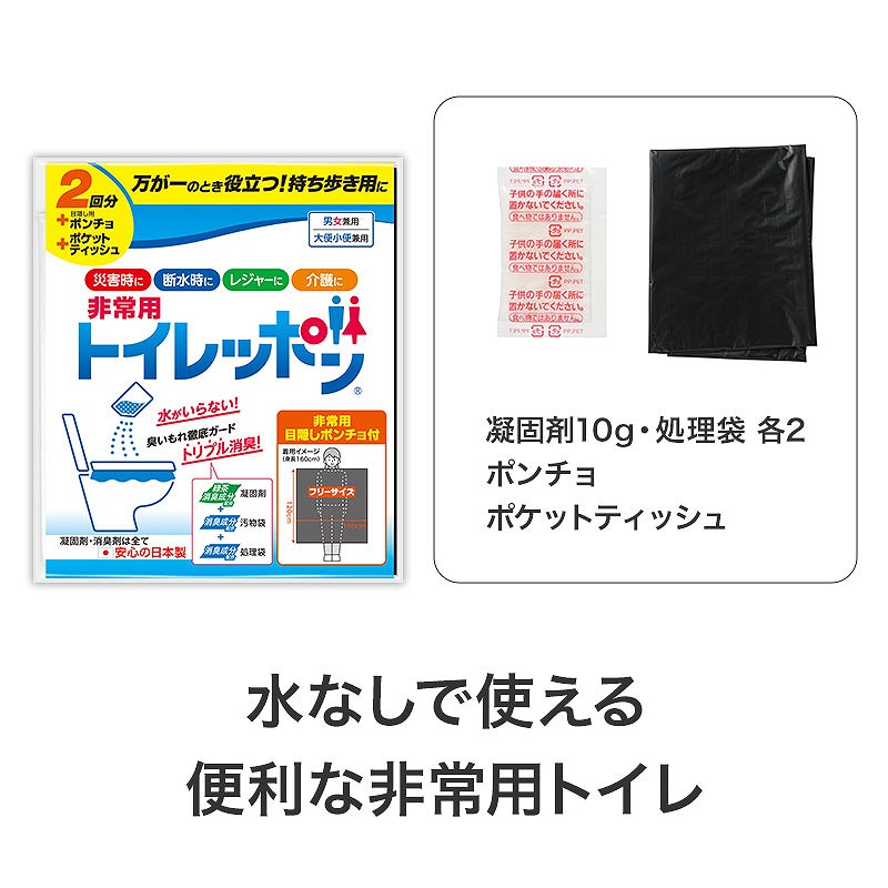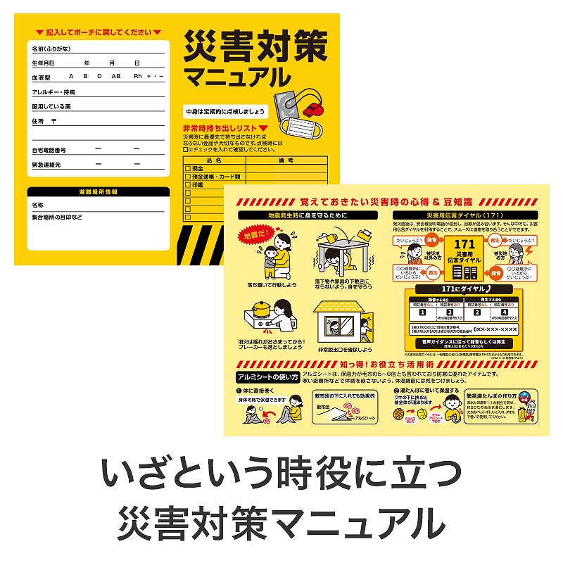 マニュアルカード/紙 LEDライト/ABS アルミシート/アルミ蒸着PETフィルム マスク/PP 笛/PS アイマスク/ポリエステル エアピロー/PVC 非常用トイレッポン2回分:凝固剤/高吸水性樹脂・緑茶消臭剤 処理袋・汚物袋/PE・消臭剤 ポンチョ/PE ポケットティッシュ/天然パルプ100%