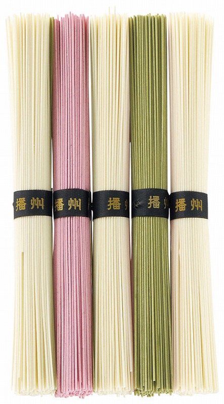 内容量/50g×5束(播州そうめん×3・紫蘇そうめん・抹茶そうめん)、賞味期間/製造日より720日